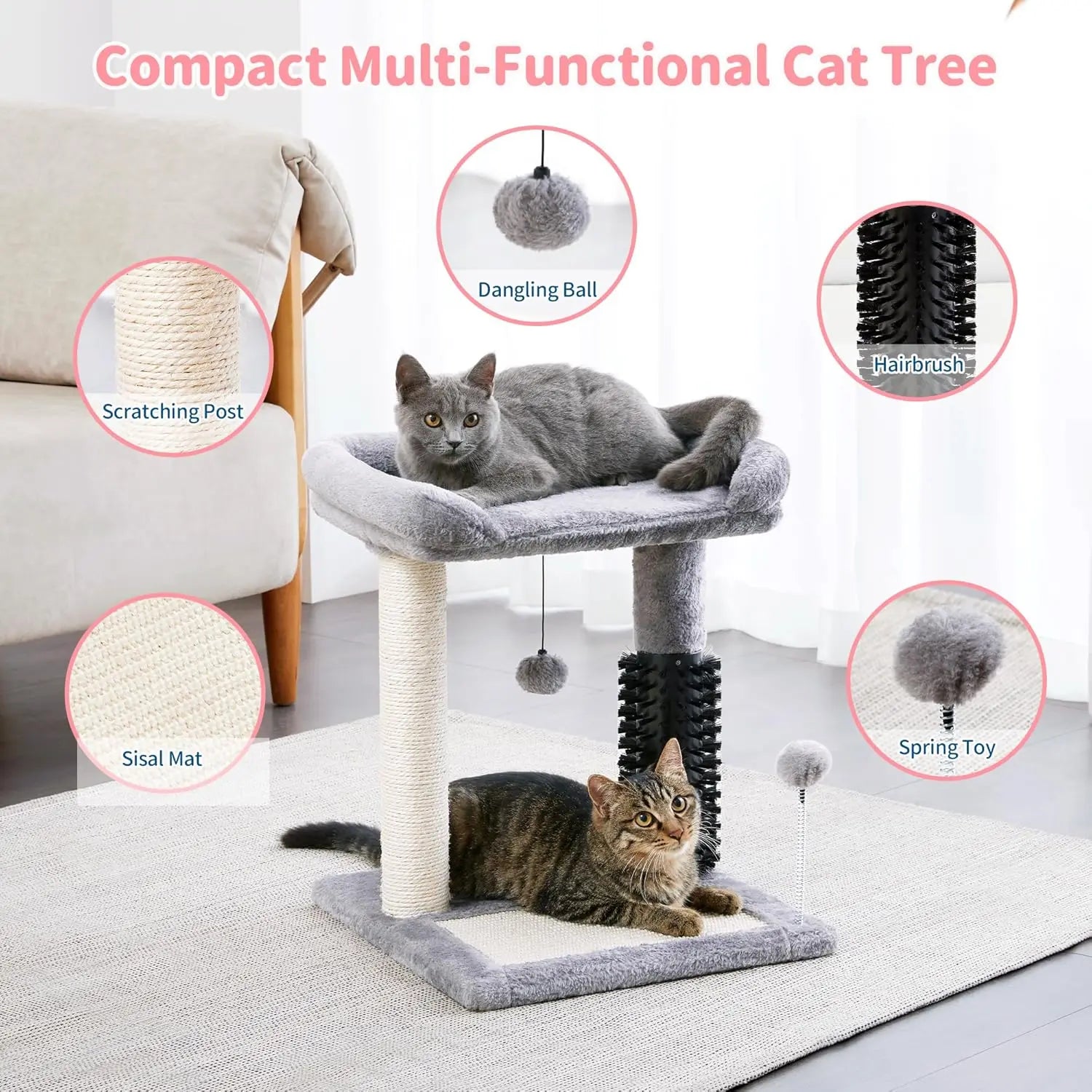 Post Natural Sisal Plush Perch Bed Dangling Toys Small 4-in-1 Cat Tree with Self Groomer - 20" Tall Grey Indoor Cat Scratching