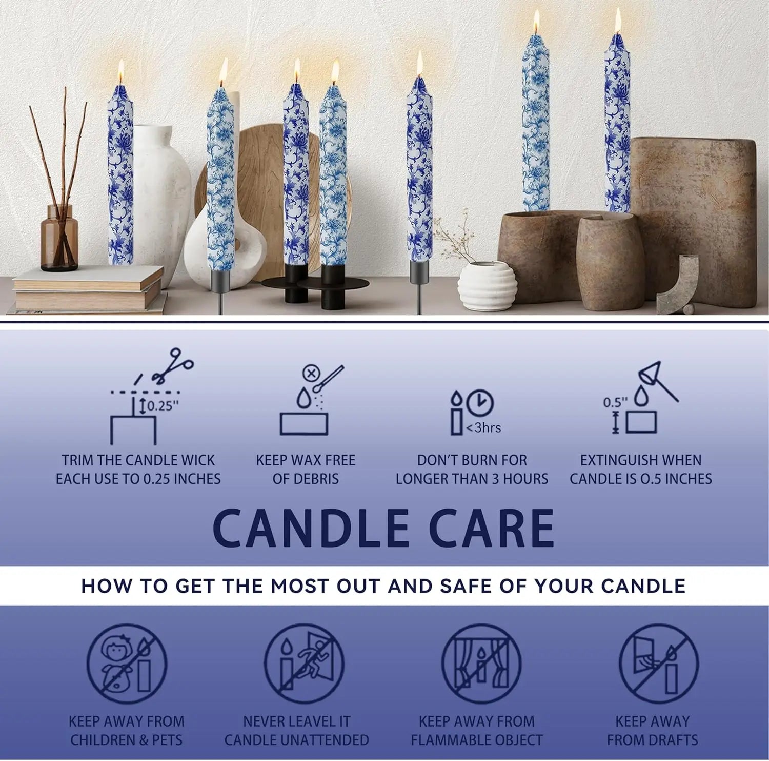 • Blue Printed Taper Candle Design: The melting point and burning speed are precisely controlled through a special formula process, to make the blue candle burn more evenly and stably;The blue and white porcelain pattern taper candle design features an elegant style and a blue white printed look that will complement almost any decor