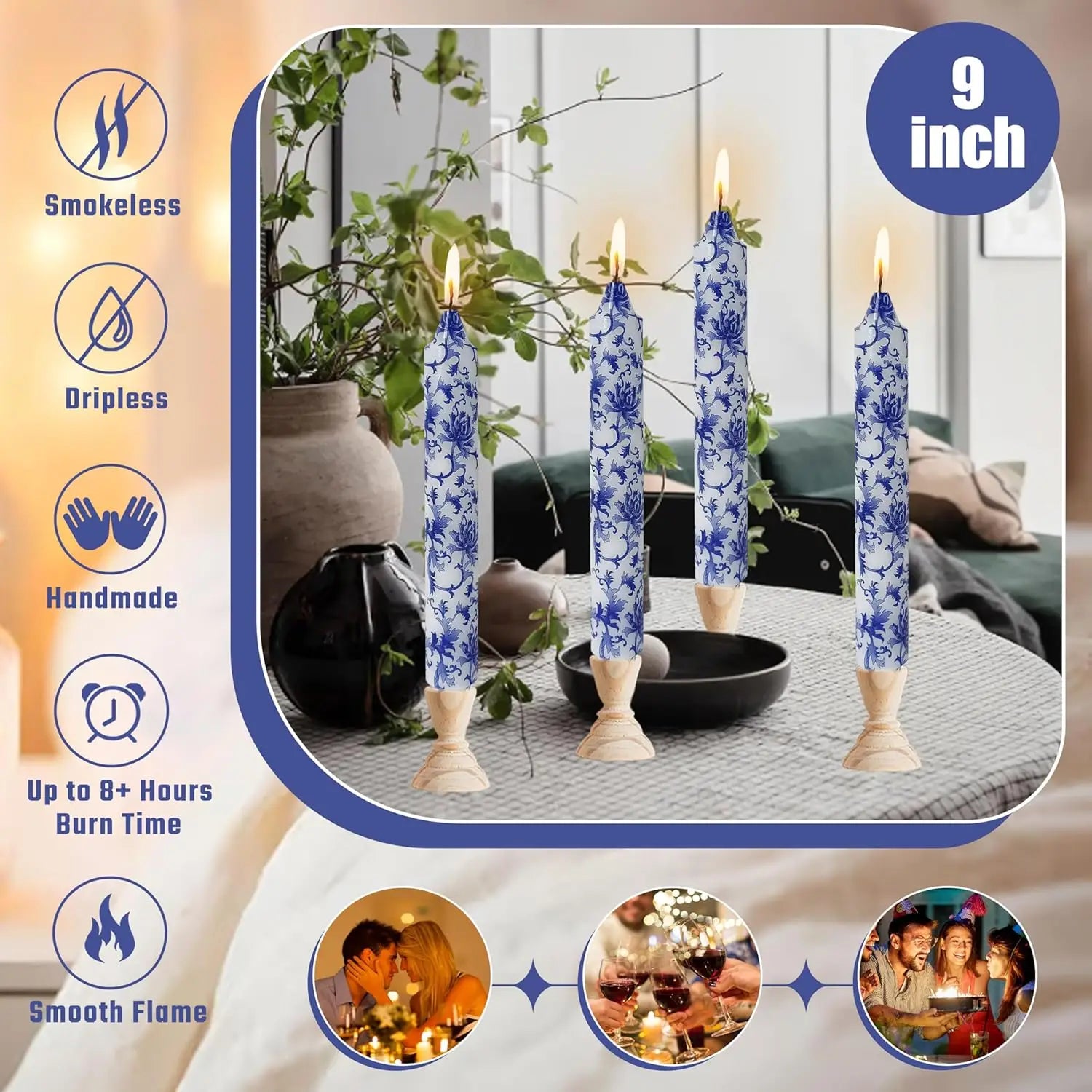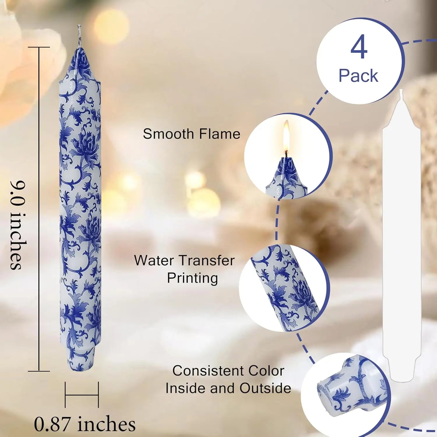9 Inch Blue White Porcelain Taper Candles Flowers Printed 4 Pack Smokeless Unscented Home Decor Special Occasions